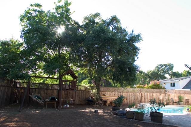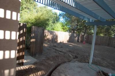 This shot was taken in late afternoon. You can see how much wonderful shade the trees provide later in the day. You can also see the partially constructed patio cover. When finished, it’ll have a sort of wraparound, multi-level quality. The as-yet-unbuilt section will be a little higher. Paint, which isn’t finished, is a blue and navajo white combo. Oh, and see how the round patio section just outside the future French doors (aka 6′ slider) slopes weirdly? It’s a little exaggerated because I used a wide-angle lens, but not much. I still have to figure out a new use for the space. Firepit? Hmmm… probably not a good idea under a wood patio cover. Lounge chairs or Adirondack chairs maybe? Ooh, maybe those really cool Sky Chairs you see every year at the fair and that I saw again at the S.F. Flower & Garden Show!