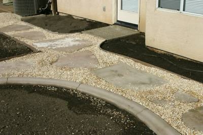 Crushed rock and flagstone. The rock is still a little dusty. After rinsing, it’s more of a peachy color.