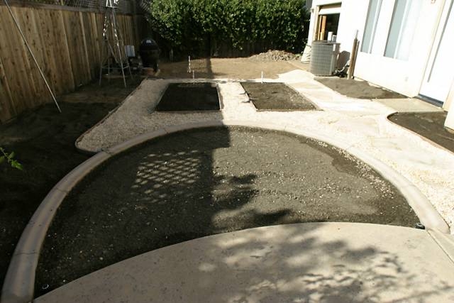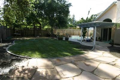 Flagstone sitting area and lawn… LAWN, with real live sprinklers and everything!!!