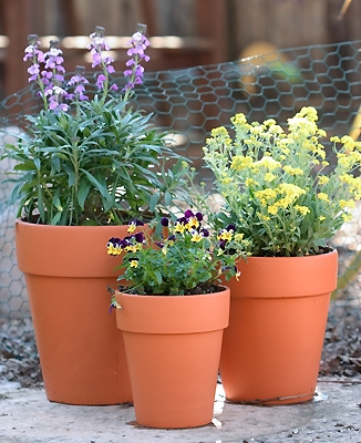Nice pottery selection too! My friend splurged on 2 gorgeous glazed mexican wall pots. I got a nice (and very decently priced) trio of what I always think of as “British herb pots.” They’re like normal red clay pots, only taller. Since I had nothing in mind for the pots, I had to buy a lavender wallflower, yellow alyssum and edible Johnny Jump Ups (as seen in the above photo).