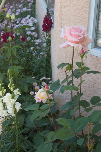 Two of my fave hybrid teas, ‘Medallion’ and ‘Peace’, are blooming. Scored these at Home Depot last fall for next to nothing. Also got ‘J.F.K.’ and ‘Chrysler Imperial’ at the same time. ‘Medallion’ blossoms are HUGE!!!