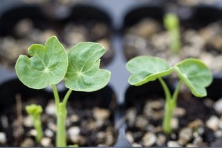 On the seed front, several flower varieties are germinating in the greenhouse. Pictured below are my nasturtium ‘Whirlybird Cherry Rose’ seedlings. Nasturtiums are so fun to germinate because they always seem to come up, the seeds are big and round and easy to plop into seed-starting mix, and they germinate very quickly. Whenever I start wondering if the seemingly microsopic seeds I planted simply blew away or are just taking their sweet time germinating, I just look at my nasturtiums for comfort. Good old dependable, visible-to-the-naked-eye nasturtiums…