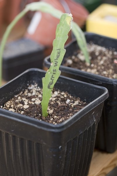 I bid on and won two unrooted cuttings of ‘Slightly Sassy’ epiphyllum on ebay and was given ‘Ferris Wheel’ and another variety as a bonus. I’m finding more and more that ebay can be a great source for new and interesting plants. And “Epis” can be addicting. I started with an unrooted cutting of a red-flowering epi from a friend. It’s done very well and now I’m able to share it around. Yep, epis are addicting and epis are for sharing.
