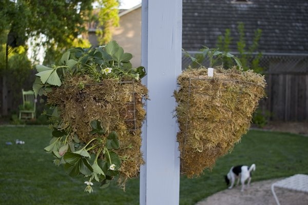 Most of my strawberries and tomatoes are in the ground, but I wanted to try some in hanging baskets for fun and to see if they’re less affected by pests and diseases. I had some old wire baskets lying around that seemed like they’d be big enough.
