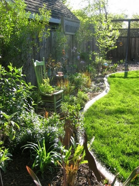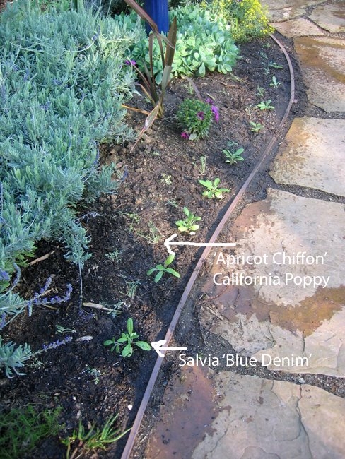 To fill in the front of this border, today I planted some greenhouse-raised annuals– ‘Apricot Chiffon’ California poppy and Salvia ‘Blue Denim’. I had first seen ‘Apricot Chiffon’ poppies blooming at Annie’s Annuals. But at $5.95 a pop, I’m glad to have found a seed source. Just this little section required 23 plants. That’s $136.85 in Annie’s currency. Seeds were $2.35 from Territorial Seed Company. Now normally I simply broadcast California poppy seeds in autumn, but hybrids like ‘Apricot Chiffon’ never come up (for me) while regular old Eschscholzia