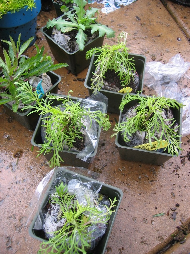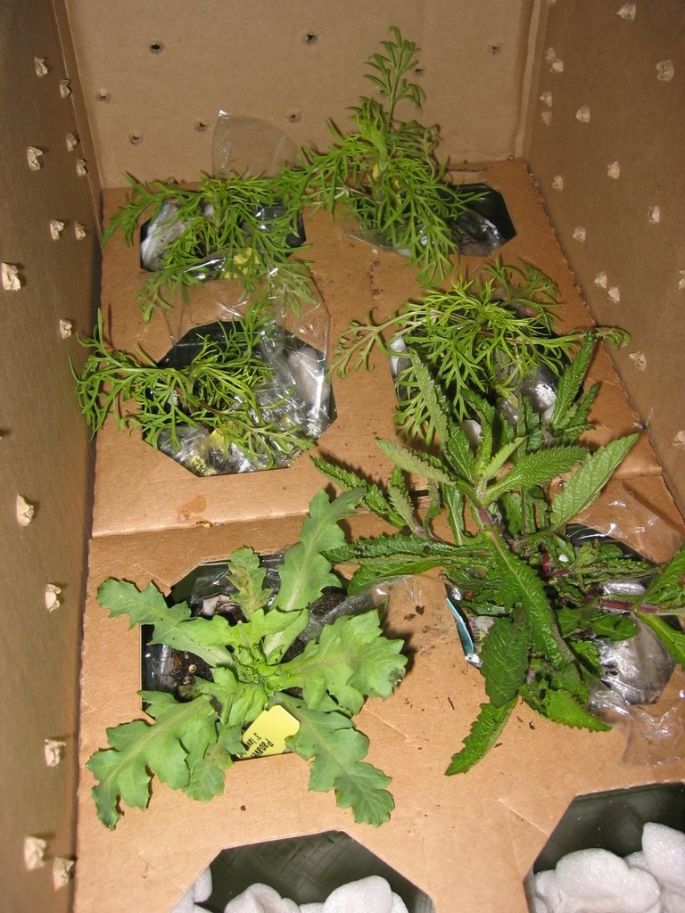 As usual, everything arrived from Annie’s Annuals & Perennials ultra-well-packaged. Each potted plant’s rootball was wrapped in newspaper, bound with a rubber band and enclosed in a sandwich baggie, then placed in a new 4″ plastic pot. The plants were held firmly to the bottom of the box by specialized cardboard boxes, on top of which popcorn filled every remaining nook and cranny. Those plants ain’t goin’ anywhere! Holes were punched in the box for improved air circulation.