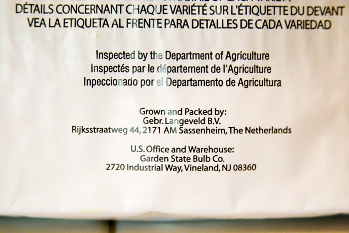 Where the heck are my bulbs from? Let’s see… looks like they’re from the Netherlands’ Langeveld Bulb Co., by way of Garden State Bulb Co. (the U.S. office and warehouse) in New Jersey.