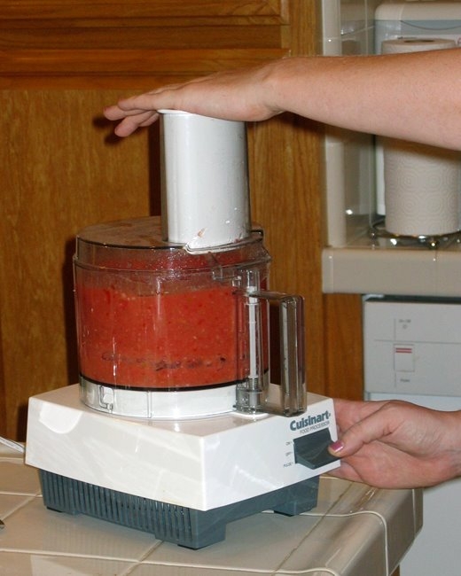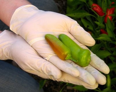 I wore latex gloves from the get-go because I’m a big chicken. Proving even more what a big chicken I am, I used greenish Fresnos because the red ones are much hotter. Ok, and I scraped out the seeds. I was probably one step away from leaving the hot peppers out entirely.