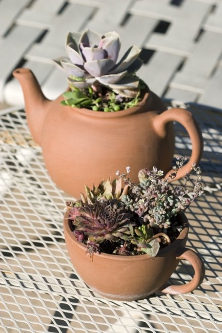 I replanted my little terra cotta teapot and coffee cup with succulents. They look pretty cute and can go longer without water than when I had pansies in them.