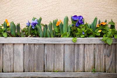 These pansies and tulips are loving being tucked up against a stucco wall on the southwest corner of the property.