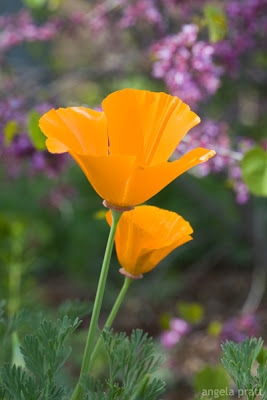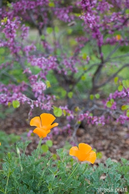 Calif. Poppies against Western redbud (Cercis occidentalis)