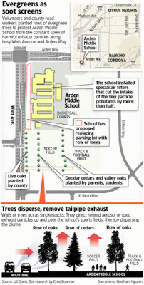 This is a great idea. For years, I’ve wondered about the air quality at Arden Middle School. In fact, I decided to take it out of the running as a potential middle school for my son because of my own (usually overprotective) air-quality concerns. Back then it was just a hunch. Now the high concentration of particulate pollution at the school has been verified, quantified and they’re working on an arboreal solution. Yay trees!