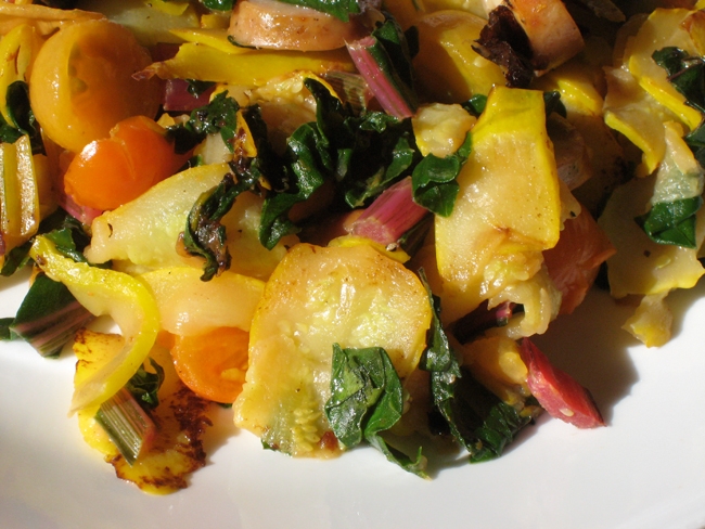It may be nearly December, but I’m still harvesting ‘Rainbow’ Swiss chard, ‘Sungold’ tomatoes, and ‘Gold Rush’ zucchini from the garden. They make a great stir-fry, along with Amy’s Apple & Gouda Cheese chicken sausages. Yum… and yes, I’m trying to do a little damage control for holiday wickedness.