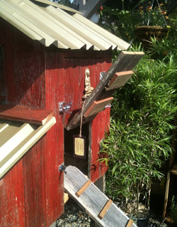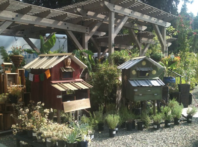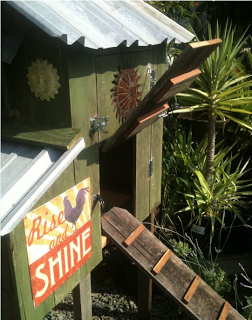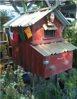 The City of Sacramento unanimously approved the right for City residents to keep up to three backyard chickens. Hens, to be exact. No cockadoodledoos. And at my workplace, Talini’s Nursery, we just started carrying these wonderful, embellished chicken coops made by Greg and Brian at Two Flew the Coop.